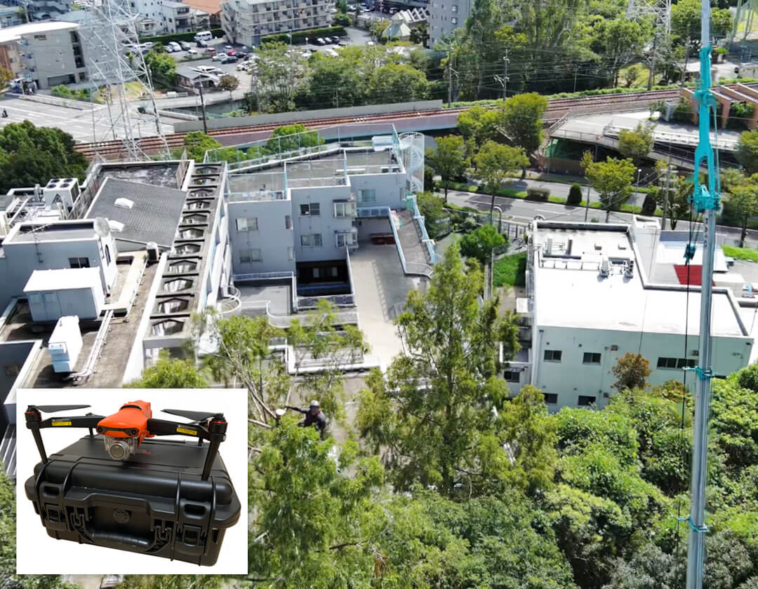 ドローンを使用して、人では確認できない樹木の上部の状態や周りの状況について調査いたします。