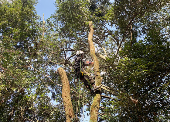 樹木の下には障害物が多くロープを使い吊りながら安全に剪定をさせて頂きました。高木剪定6本を3日間で終わることができました。